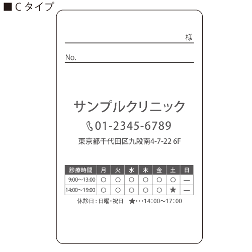 ※裏面タイプ、C、D、Eタイプをお選びの場合、医院名、お電話番号、住所、診療時間をお伺いし、反映させていただいた後に印刷させていただきます。