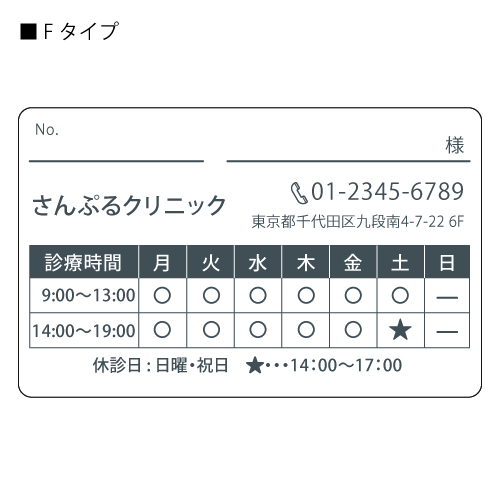 ※裏面タイプE、F、G、H、I、Kタイプをお選びの場合、医院名、お電話番号、住所、診療時間をお伺いし、反映させていただいた後に印刷させていただきます。