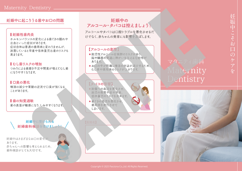妊娠中に起こりうるお口のトラブルや、マタニティ歯科の大切さなどを分かりやすく解説した内容となっています。