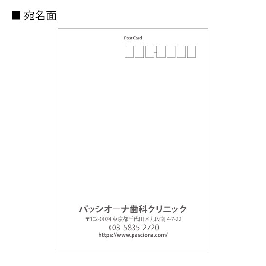 宛名面に、医院情報(医院名/ご住所/電話番号/URL)を入れて印刷いたします。