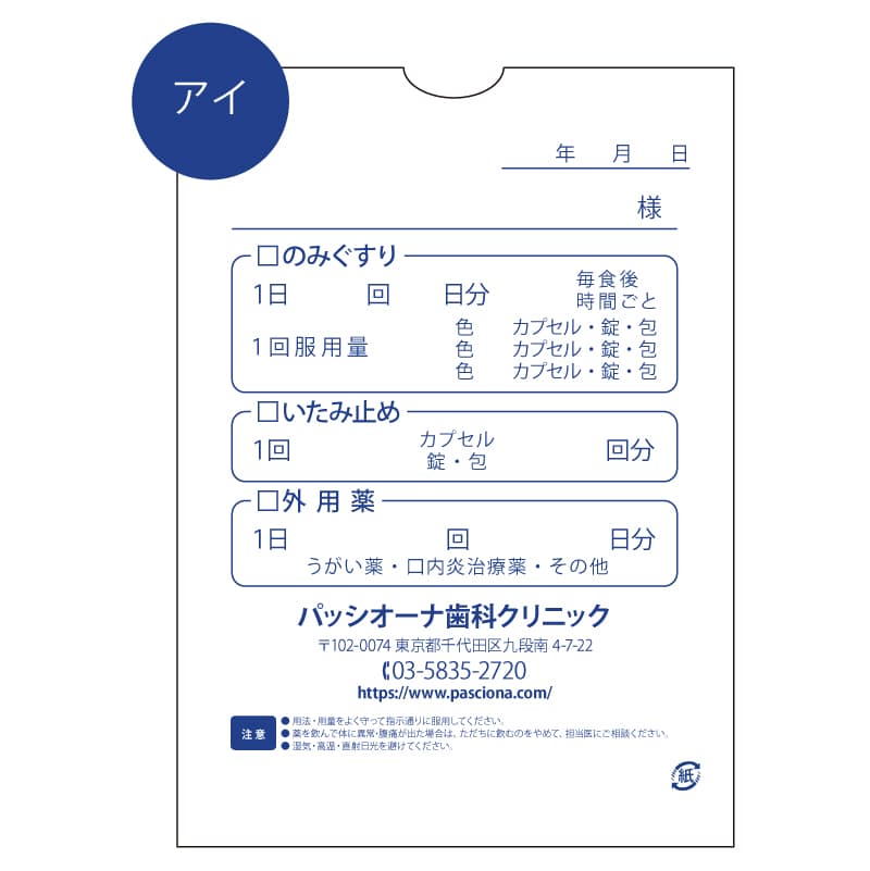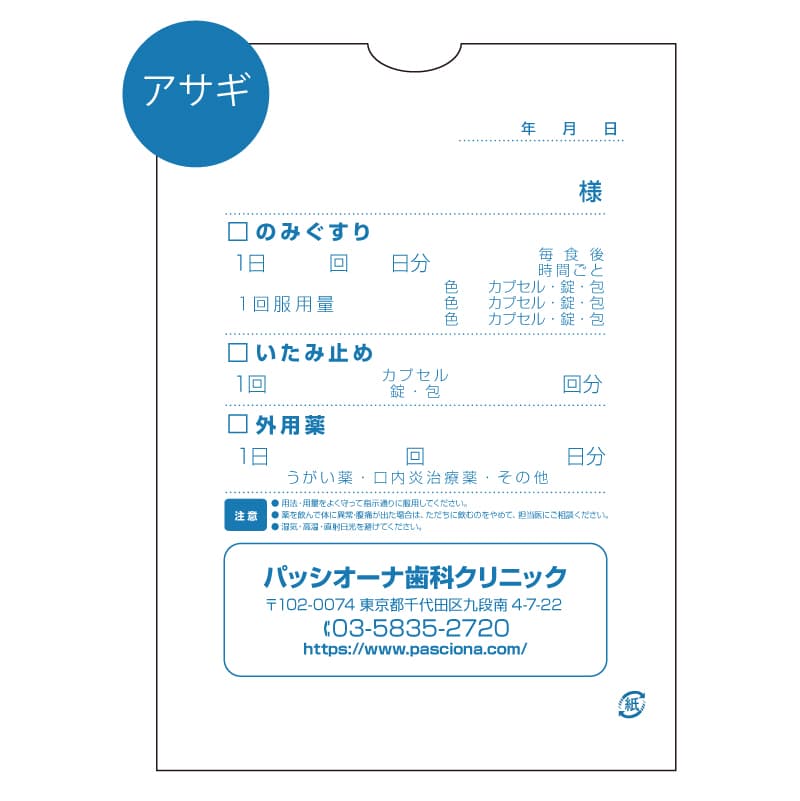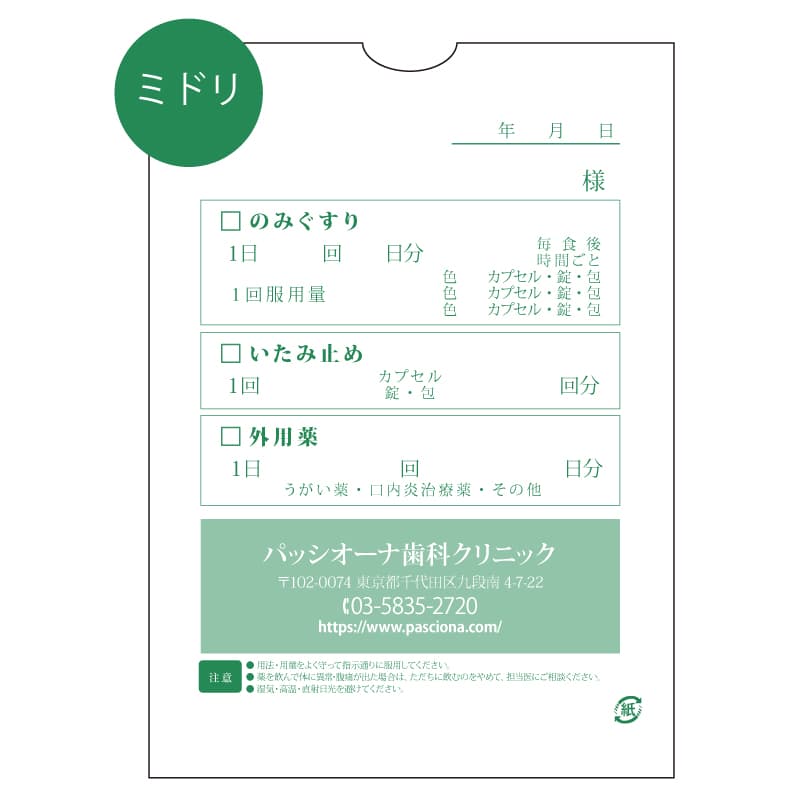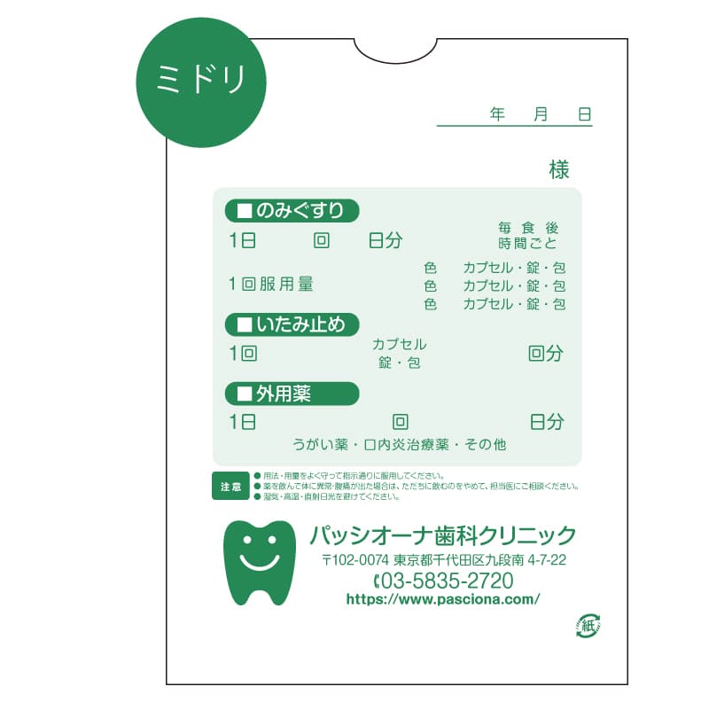 お薬の処方時に使用する、クリニック向けの薬袋です。デザイン・カラーは5色から選択でき、医院名・ご住所・電話番号・URLなどの情報差し替えに対応。医院ロゴも掲載でき、院内の雰囲気やブランディングに合わせたカスタマイズが可能です。日常業務の中でも、統一感のある印象を演出します。