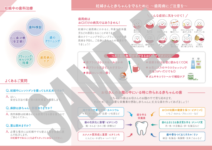 妊娠中に起こりうるお口のトラブルや、マタニティ歯科の大切さなどを分かりやすく解説した内容となっています。