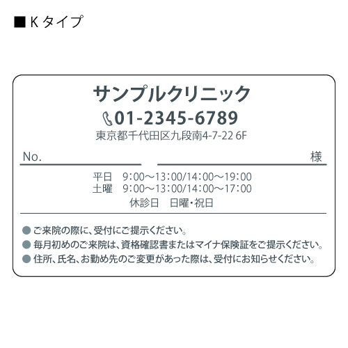 ※裏面タイプE、F、G、H、I、Kタイプをお選びの場合、医院名、お電話番号、住所、診療時間をお伺いし、反映させていただいた後に印刷させていただきます。